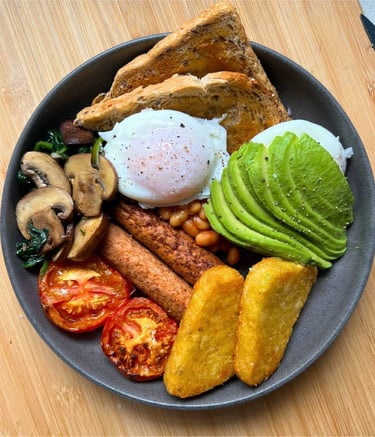 The Morning Meadow: Halloumi, vegan sausage, poached eggs, spinach, tomatoes, mushrooms & beans.